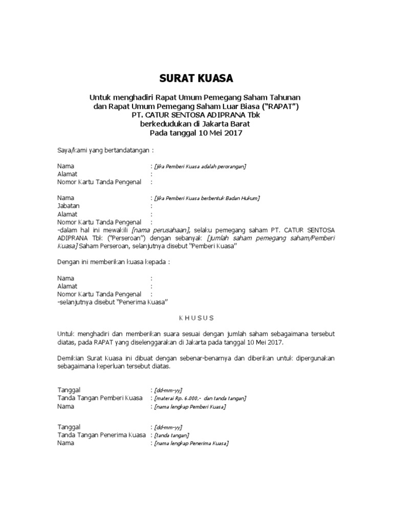 Contoh Surat Kuasa Untuk Menghadiri Rapat Umum Pemegang Saham Luar Biasa 2017 Pp Properti