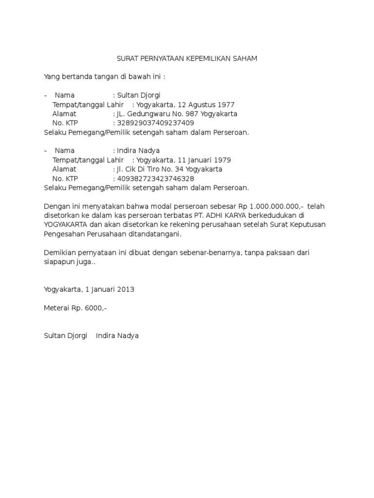 Contoh Surat Pernyataan Kepemilikan Saham Pdf